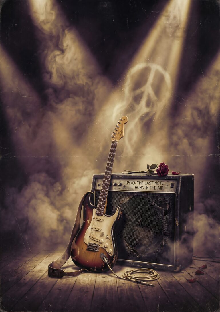 “1970: The Last Note Hung in the Air” tells a story of culmination and atmosphere. It represents the poignant close of an era, the bittersweet finale of a sonic journey. This isn’t just an image; it’s a mood piece that evokes contemplation, nostalgia, and a deep appreciation for the darker, more introspective side of music culture. It connects you to the feeling of being in that audience, breath held, as sound becomes memory.