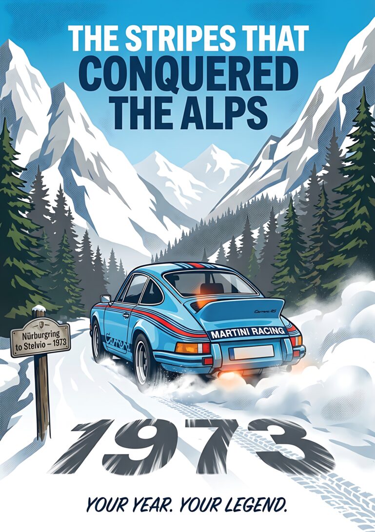 This artwork tells a story of daring, precision, and the relentless pursuit of glory. The bold stripes cutting through the majestic alpine landscape symbolize victory over nature’s greatest challenges. It evokes feelings of adventure, nostalgia, and the timeless elegance of classic racing. This isn’t just home decor; it’s a conversation starter that connects you to a legendary era of automotive history.